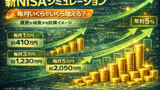投資 新NISAシミュレーション|毎月いくらでいくら増える?資産シミュレーションを解説【2026年版】 新NISAのシミュレーションを解説。毎月1万円・3万円・5万円を積立した場合の資産シミュレーションや利回り別の資産増加を初心者向けに分かりやすく紹介します。資産を増やすためには長期投資の方がおすすめです。 2026.03.06 投資